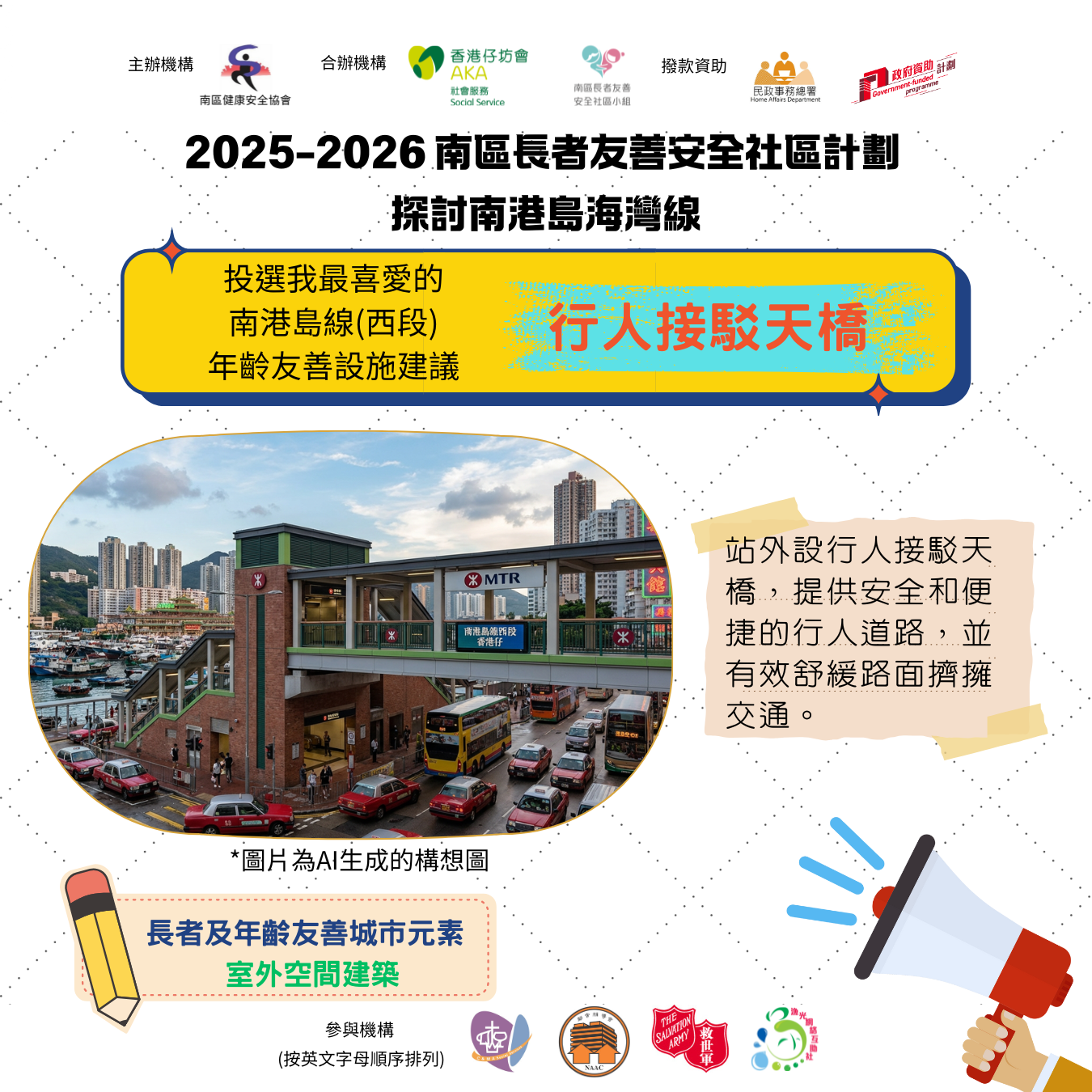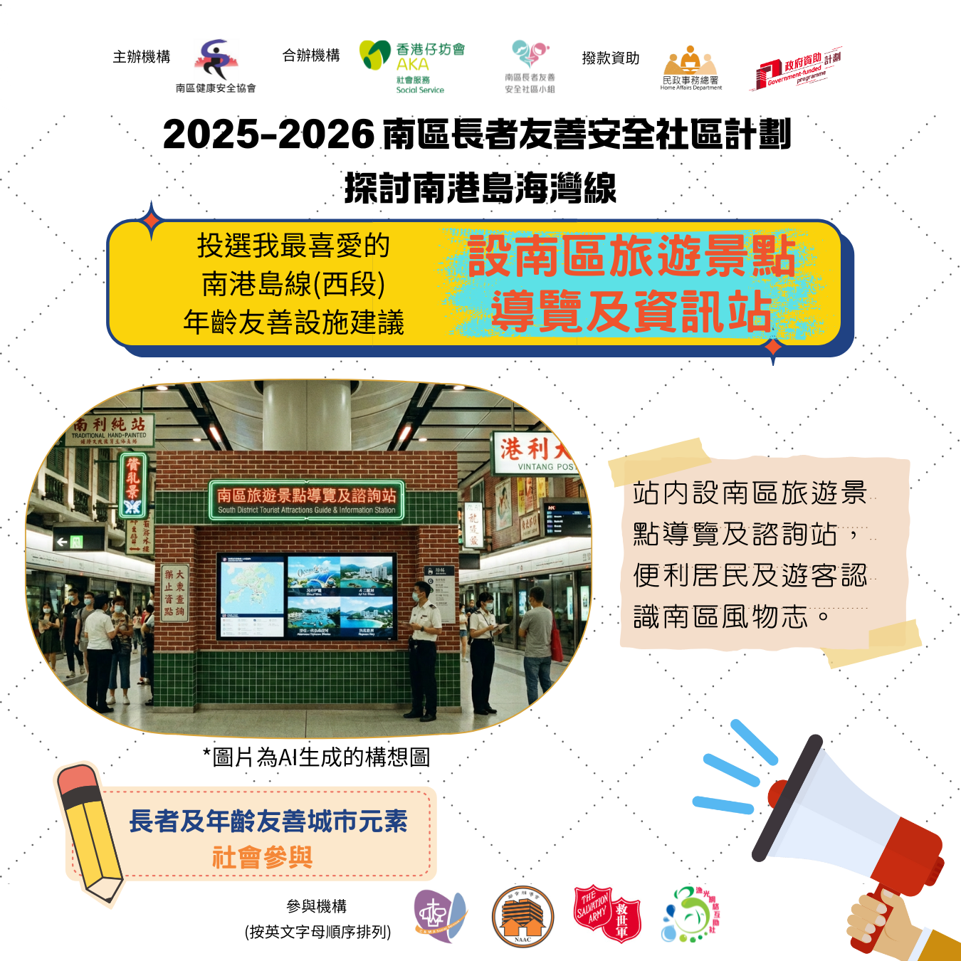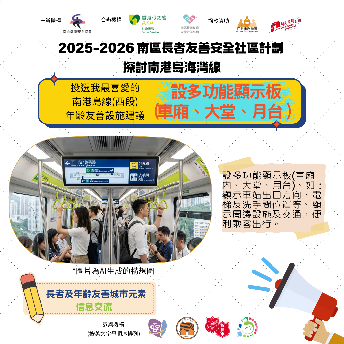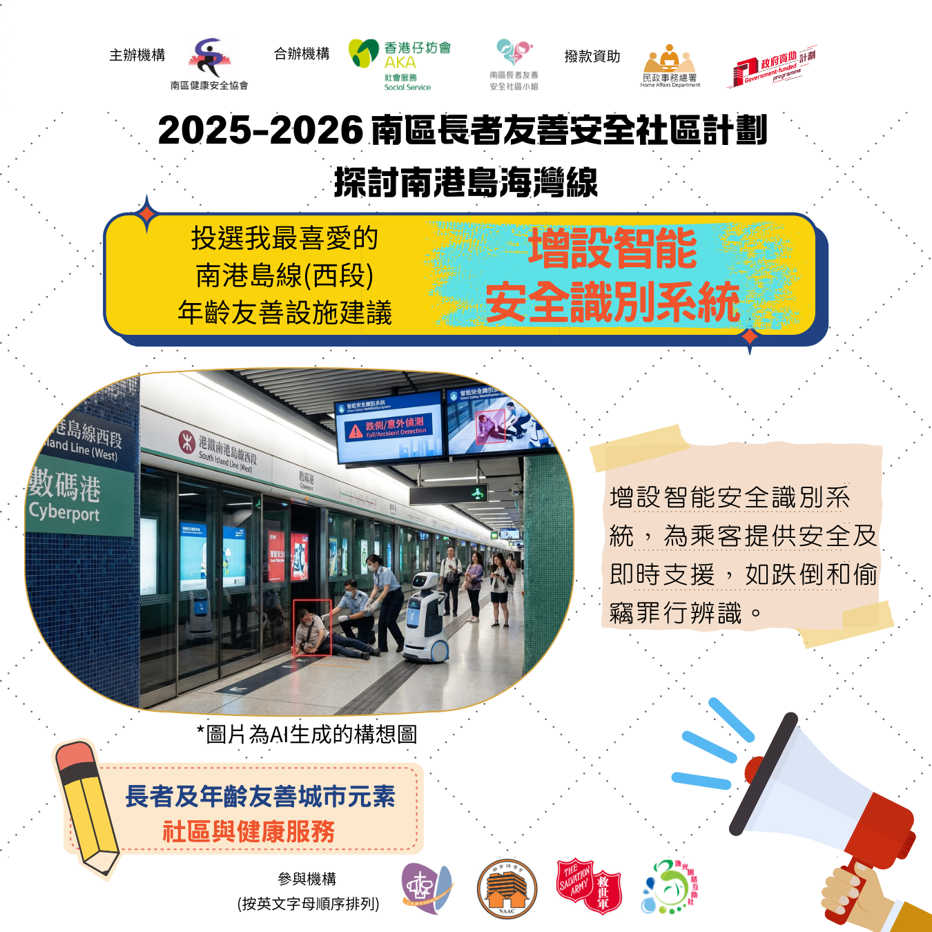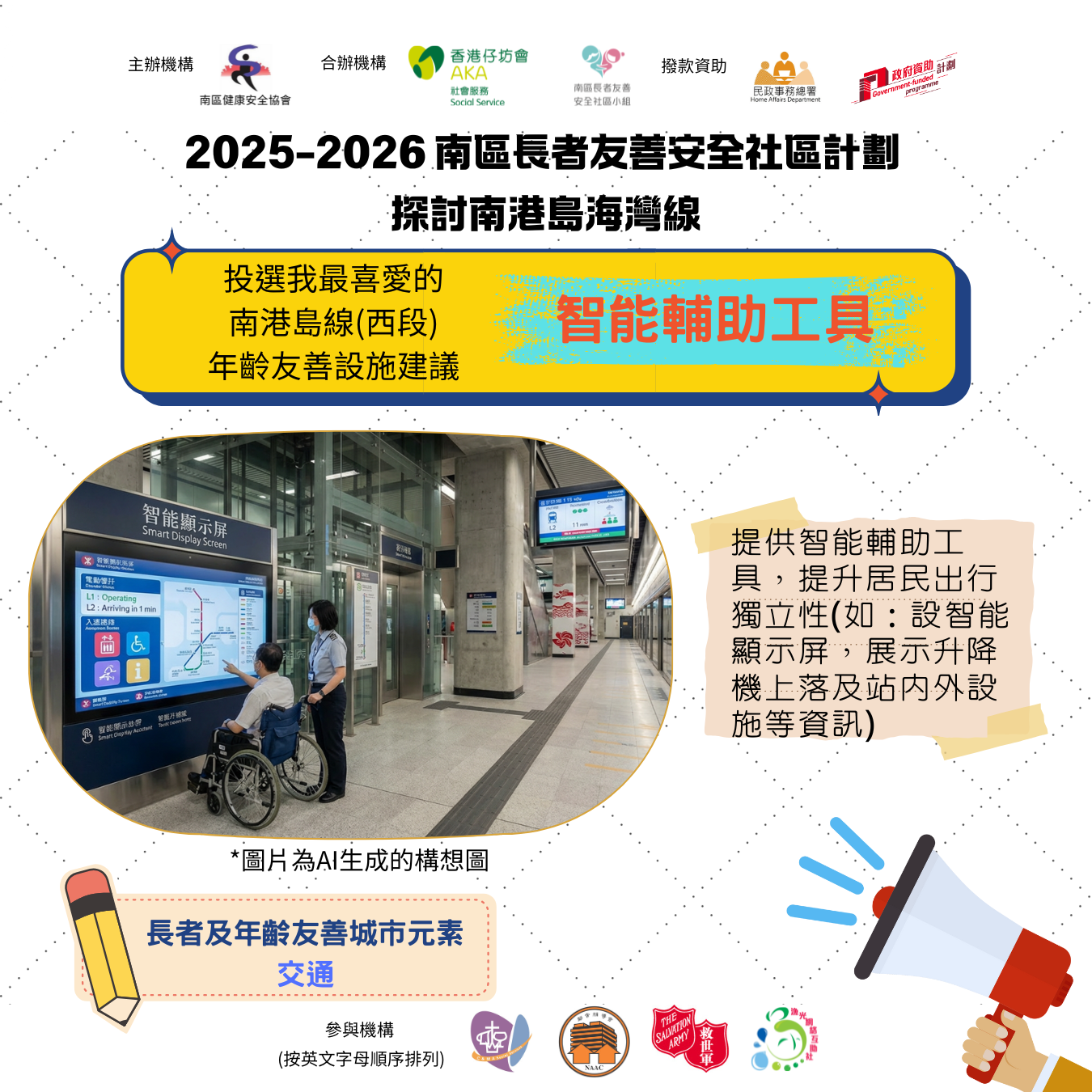 南區長者友善安全社區小組過去持續關注不同的民生議題,推動年齡友善社區。本年度計劃以香港鐵路南港島線(西段)的友善措施為主題,推動長者友善大使透過不同活動內容,共商長者及年齡友善措施和各項建議,鼓勵長者友善大使以「用家角度」發聲,發揮長者友善「由下而上」的精神,建構「長者及年齡友善安全社區」,並向社區持份者反映。