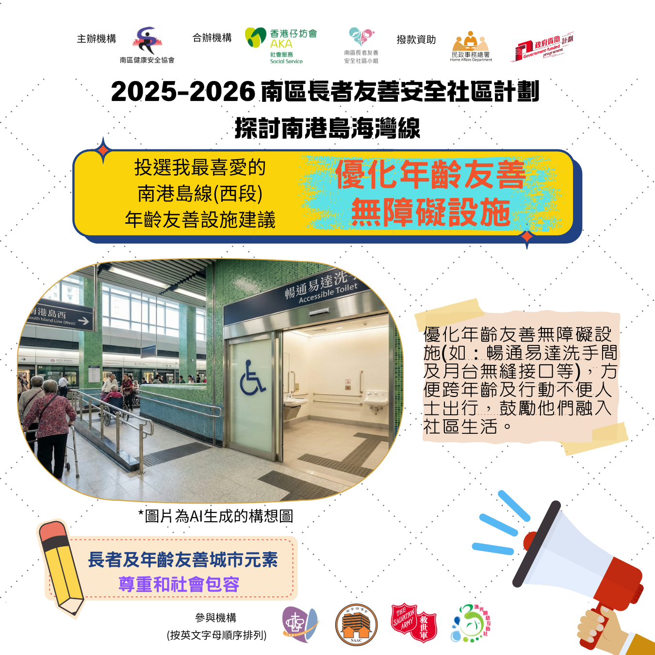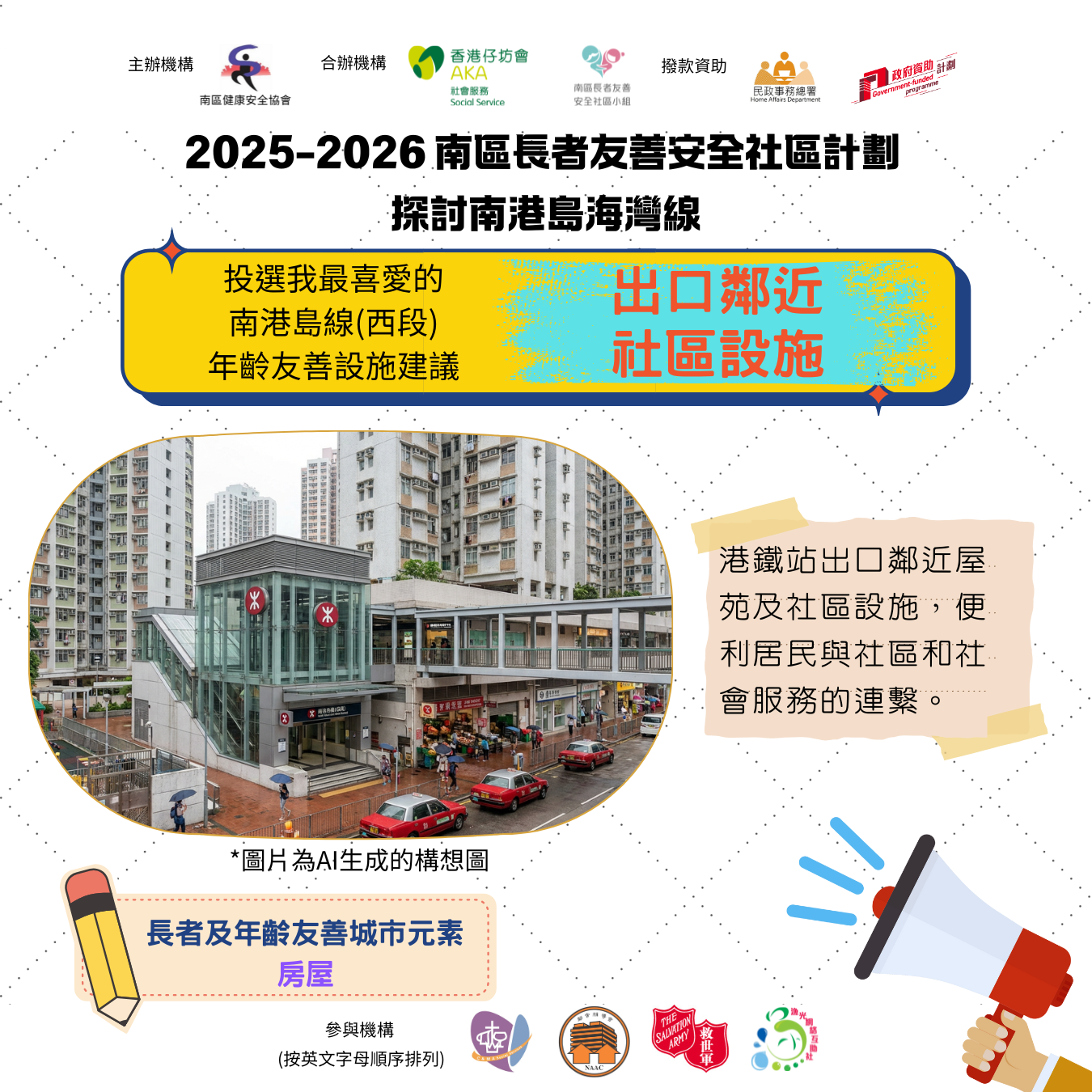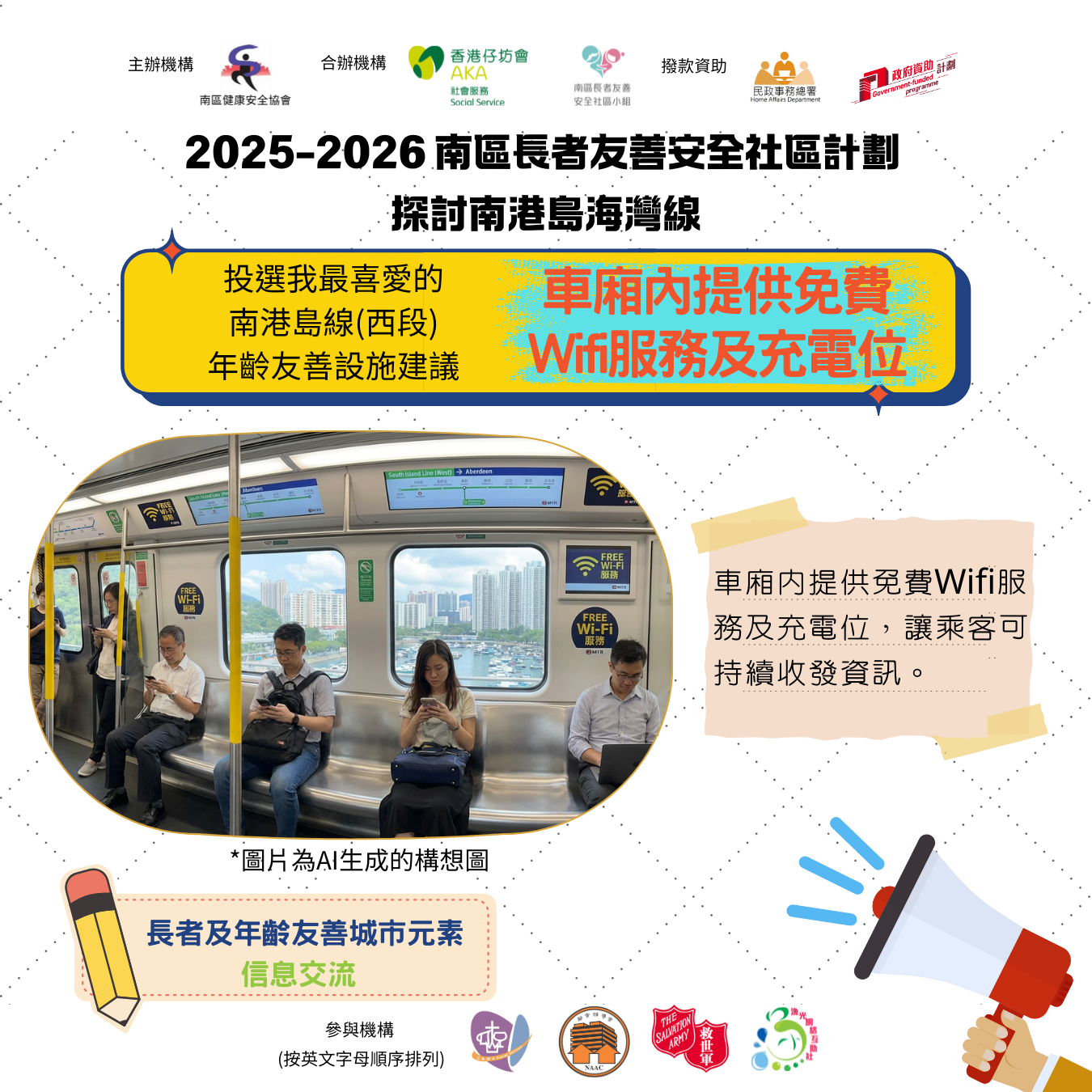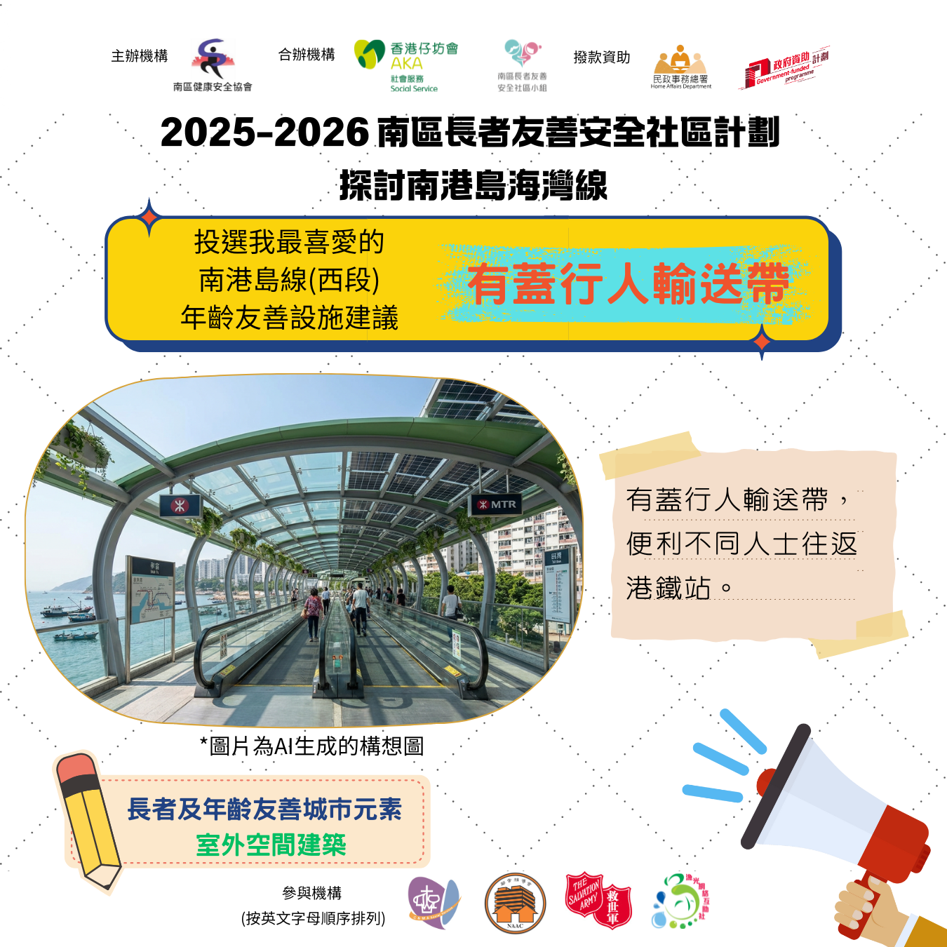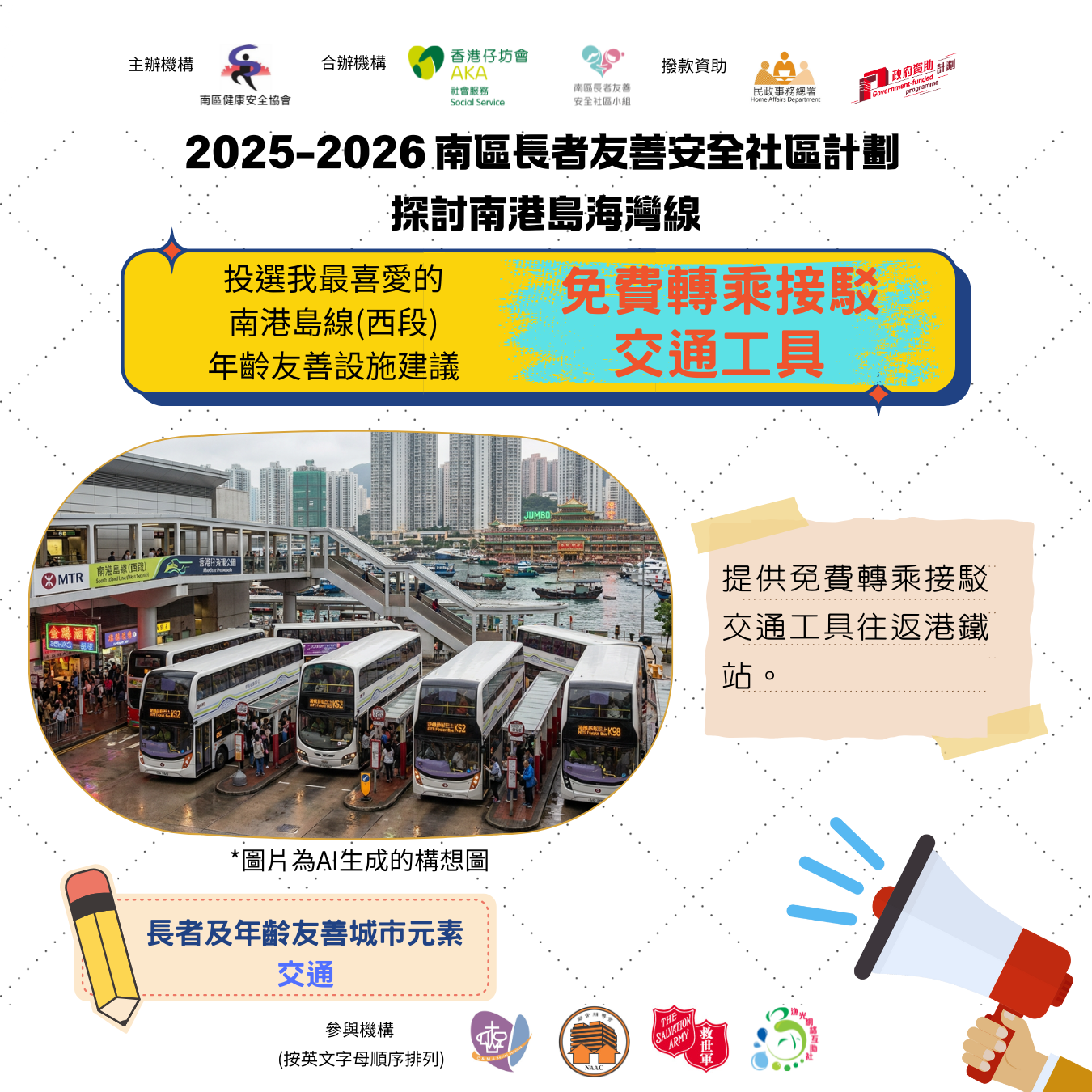南區長者友善安全社區小組過去持續關注不同的民生議題,推動年齡友善社區。本年度計劃以香港鐵路南港島線(西段)的友善措施為主題,推動長者友善大使透過不同活動內容,共商長者及年齡友善措施和各項建議,鼓勵長者友善大使以「用家角度」發聲,發揮長者友善「由下而上」的精神,建構「長者及年齡友善安全社區」,並向社區持份者反映。